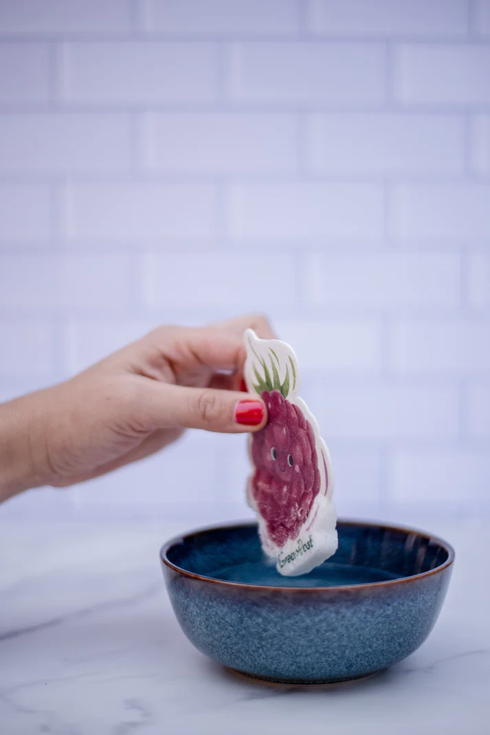 Esponja pop up con forma de frambuesa, está pensada para limpiar sin ensuciar el planeta. Es de celulosa, sirve para lavar los platos, la casa y ¡las frutas! Vienen deshidratadas para no usar espacio y se inflan cuando las mojas.